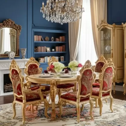 Crafted with rich gold carving, premium hand-finished detailing, and plush red upholstered chairs, this masterpiece brings a majestic palace-like elegance to your home.