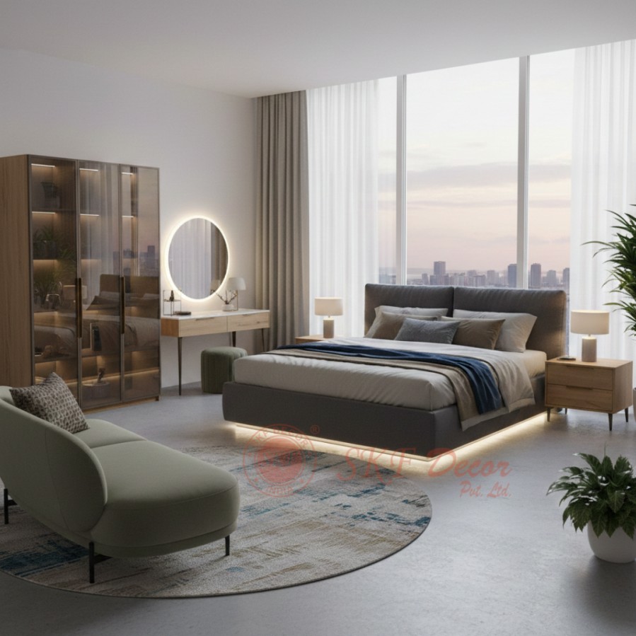 At SKF Decor Pvt. Ltd., we design modern bedroom sets that combine elegance, comfort, and smart functionality — giving your home a stylish contemporary upgrade.
