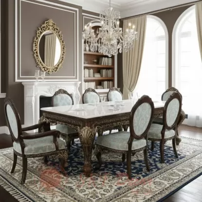 Royal Dining Table, Antique Wooden Dining Set, Luxury Marble Dining, Classic 6-Seater