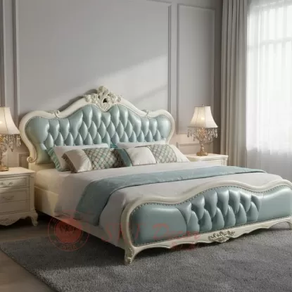 The beautifully tufted headboard, smooth curved design, and rich detailing create a calm, stylish, and graceful bedroom look — perfect for customers who prefer a soft royal aesthetic without heavy carving.