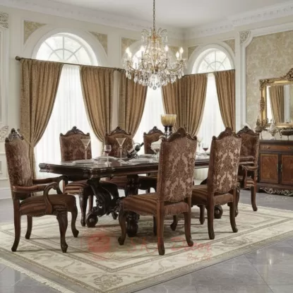 The luxurious fabric, bold carved legs, and majestic high-back chairs reflect the heritage of classic royal interiors — perfect for villas, luxury homes, and premium dining rooms that demand sophistication.
