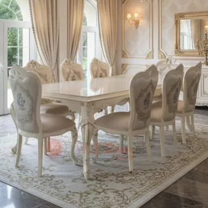 Designed for homes that desire a soft, luxurious and palace-like ambiance, this masterpiece features a premium marble-finish top, hand-carved detailing, and beautifully upholstered chairs that reflect true craftsmanship.