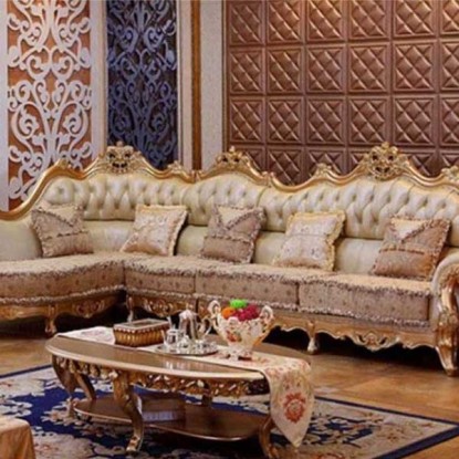 Material- L Shape Sofa set teak wood Structure premium, Designer fabric, finish Golden paint and luxury PU polish.